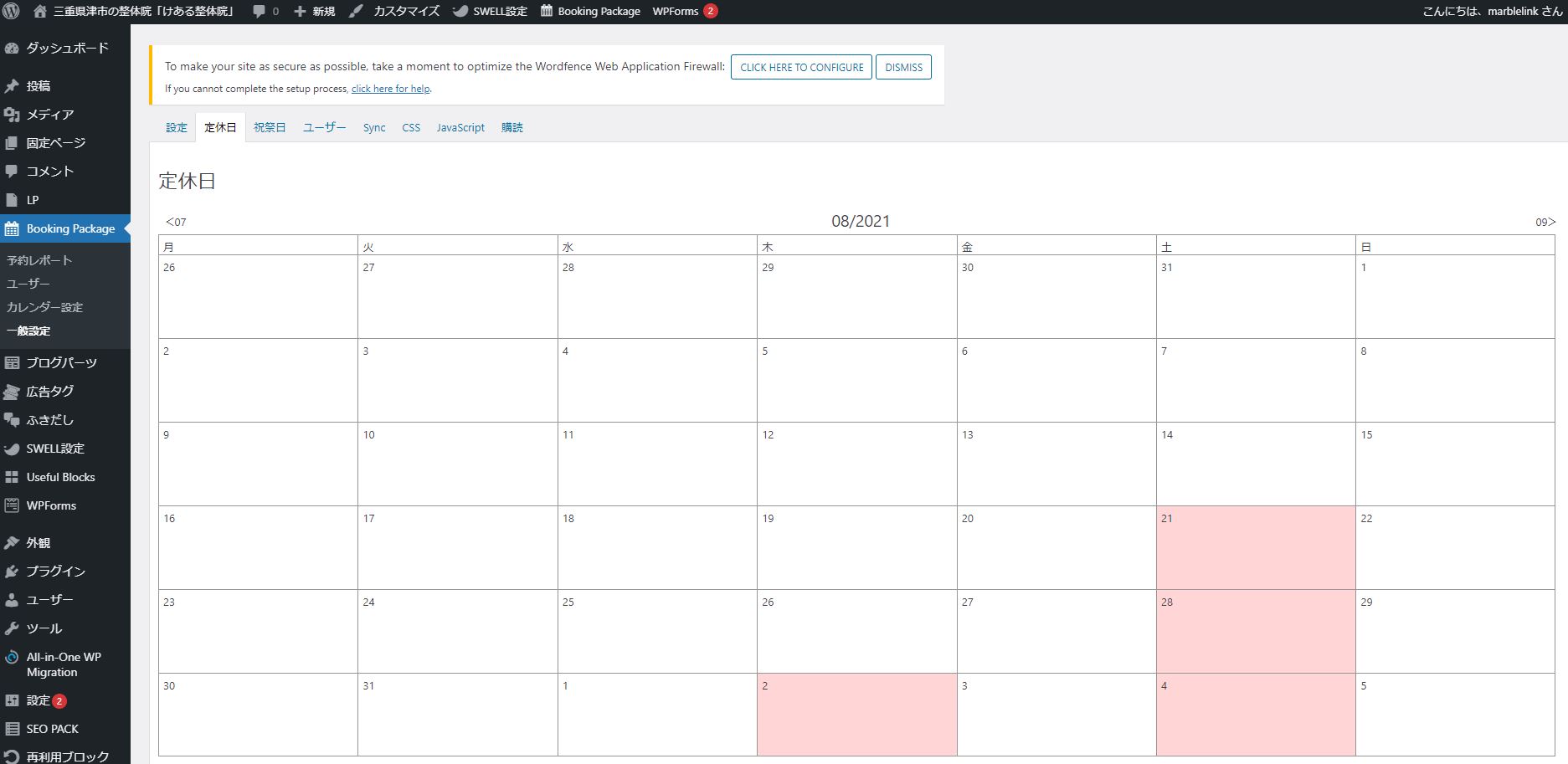 Booking Packageの「ユーザー」「カレンダー設定」は基本的に触らないようにお願いします。
